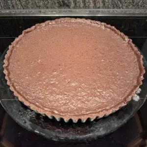 - Remove the baking paper and chickpeas from the base. Pour the filling onto the pre-baked base and bake the tart for another 15 to 20 minutes. The center may still seem slightly soft.