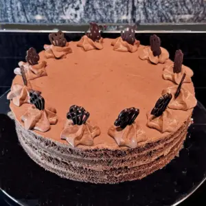 Schokoladentorte nach klassischer Konditorkunst mit zartem Biskuit und feiner Schoko-Creme in klaren Schichten. Ein zeitloser Tortenklassiker mit eleganter Optik und feinem Schokoladengeschmack.