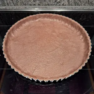 - Den Backofen auf 180 Grad Ober- und Unterhitze vorheizen. Die Tarteform einfetten und leicht mit Mehl einstäuben. Für den Boden Mehl, Zucker, Salz und Kakaopulver in einer Schüssel mischen. Ei und Butter in Stückchen dazugeben und alles zügig zu einem glatten Mürbeteig verkneten. Den Teig flach drücken und bei Bedarf kurz kalt stellen, falls er zu weich ist.